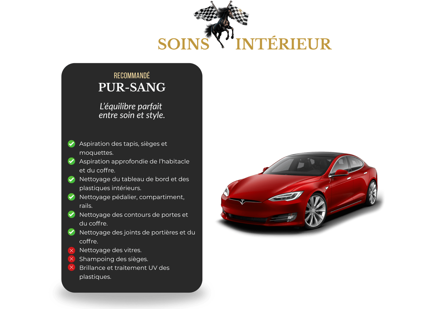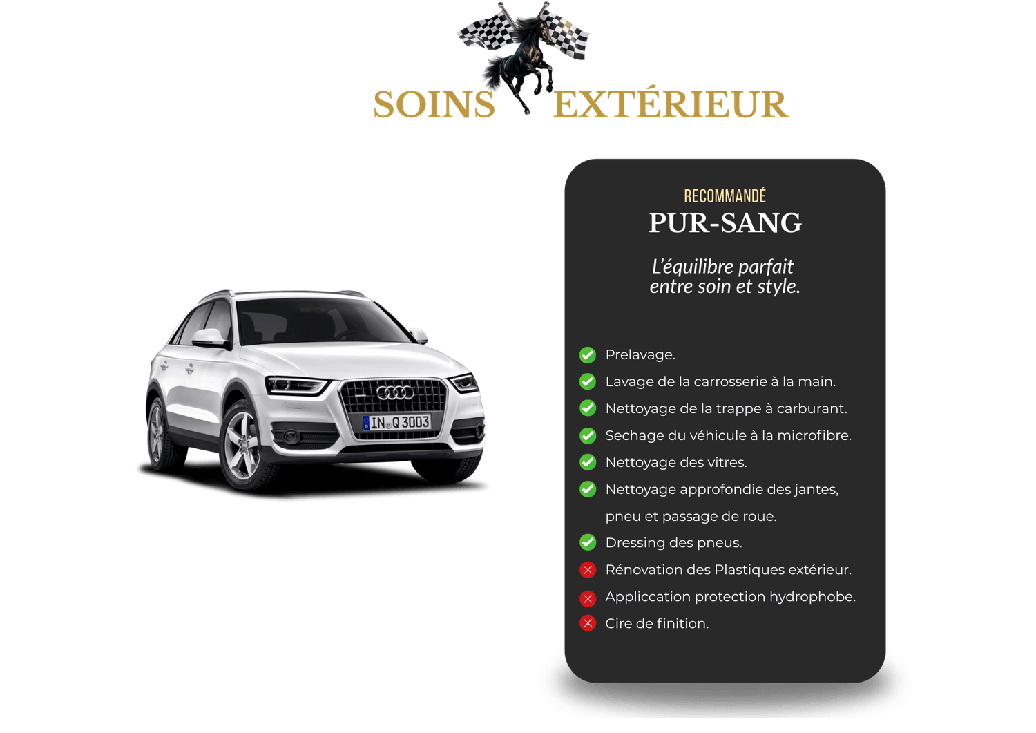 Chaque véhicule mérite un soin à la hauteur de ce qu’il représente. Nos forfaits ont été conçus comme des expériences, alliant précision, excellence et passion du détail. De l’essentiel au sur-mesure, choisissez le niveau de brillance qui correspond à votre exigence.L